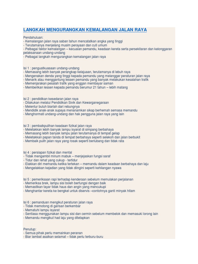 Adalah menjadi harapan saya agar rakyat malaysia akan sentiasa beringat dan berwaspada semasa dalam perjalanan pulang ke kampung halaman. Tamil salai vibathu சல வபததல. Contextual translation of contoh karangan bi tentang kemalangan jalan raya.