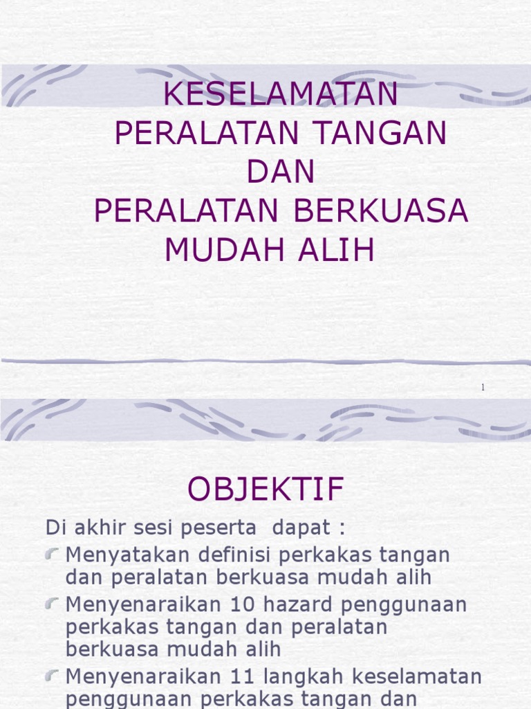 2016-12-08 Penggunaan peralatan tangan manual yang salah dan tidak tepat akan mengakibatkan cedera bagi pekerja rusaknya peralatan dan kerugian lainnya. Kemalangan elektrik seperti renjatan elektrik dan juga kebakaran elektrik boleh menyebabkan kemalangan serius sehingga boleh membawa kematian. Alat-alat bantu tersebut berupa alat-alat tangan.